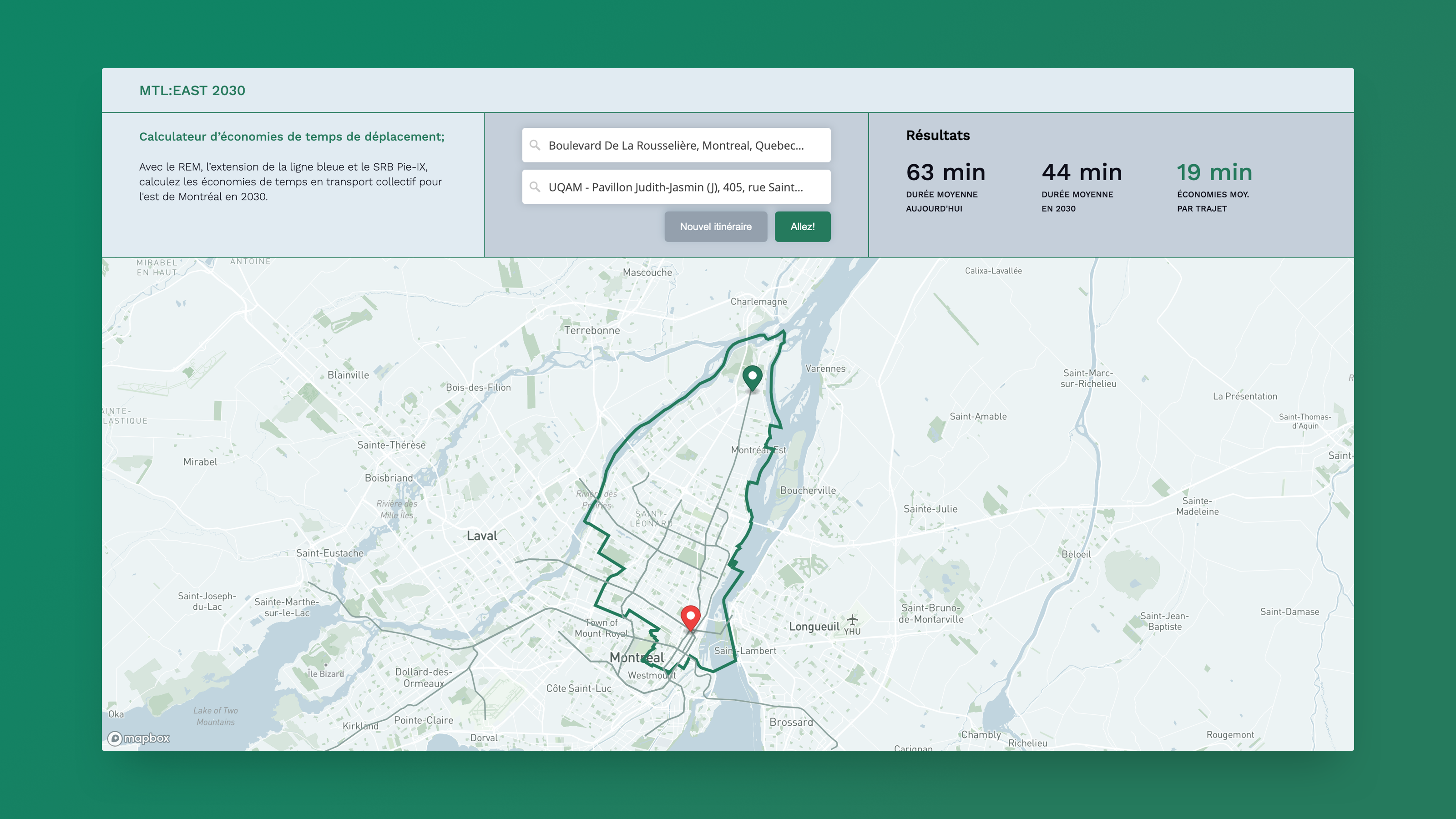 I created a tool to estimate the time savings for travellers departing from the east end of the island. The end result allows users to enter an origin and destination address, then compare the average transit travel time for 2022 VS 2030, when the REM will be operating.