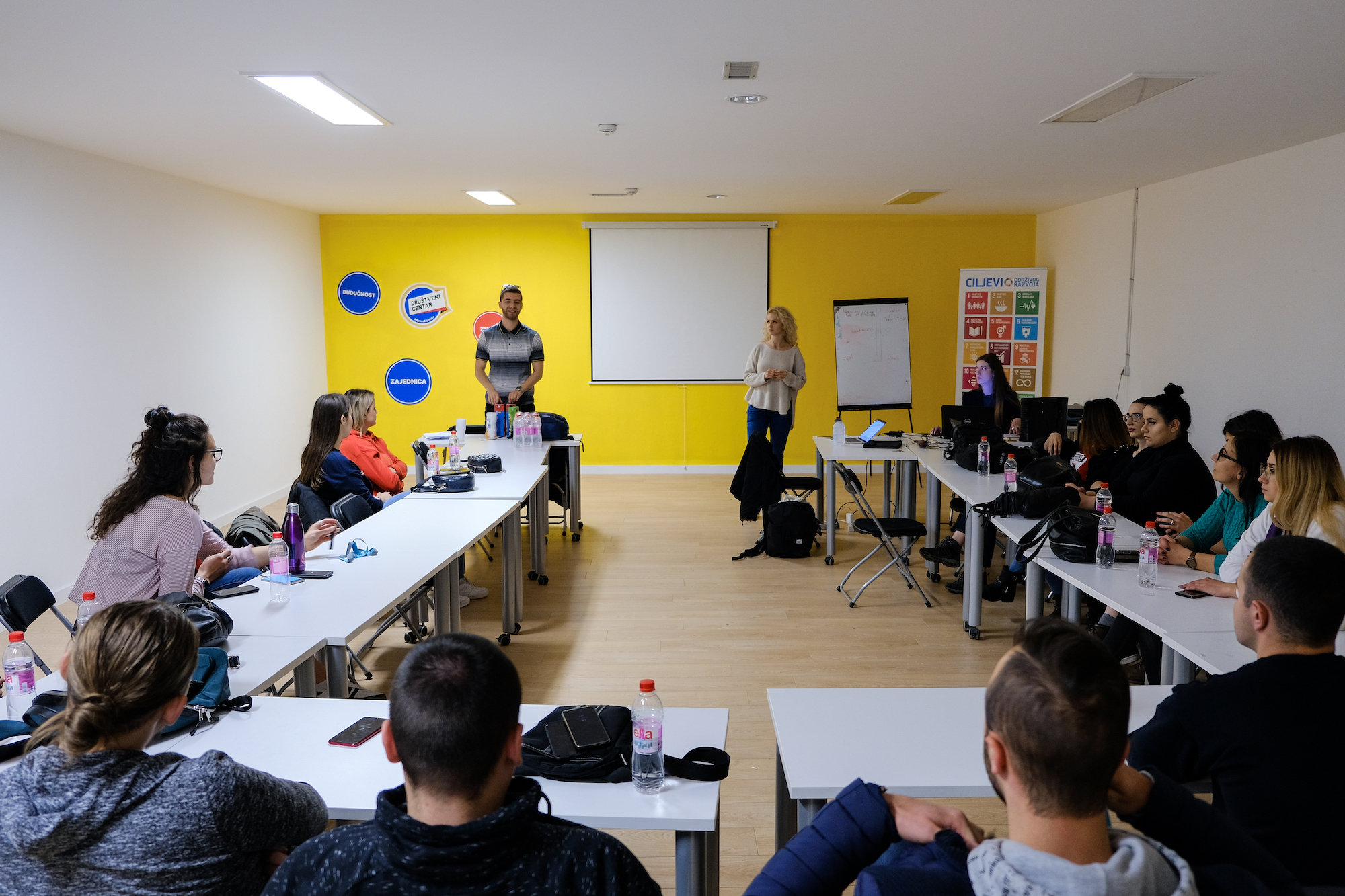 Photos: Beautiful view of the mountains surrounding Sarajevo; Local team during the training; Tram stop in the city centre; Tram on a busy street.
