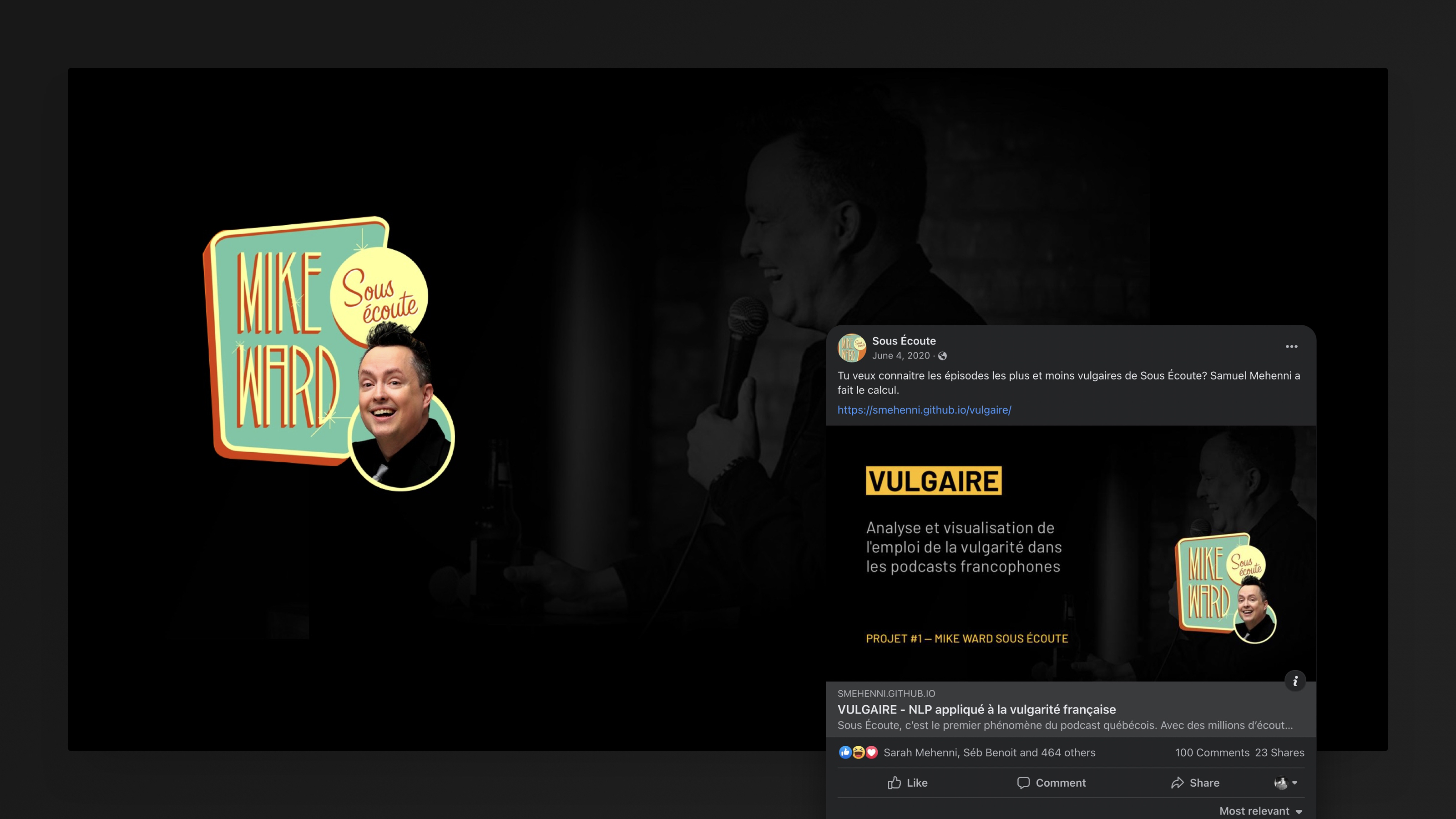 Sous écoute is without a doubt one of the most popular podcasts in Quebec. With several hundred episodes available for free on youtube, each averaging over two hours in length, it is an important archive of informal discussions between Franco-Quebecers. Given the comical and rather vulgar nature of the podcast, I had the idea to analyze the automated captions by youtube to see what insights could be obtained. The results are surprising.